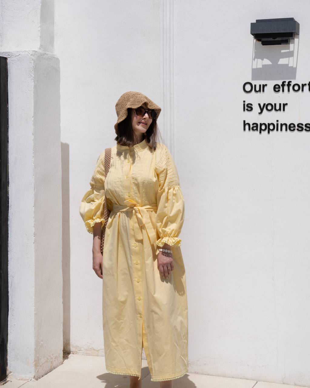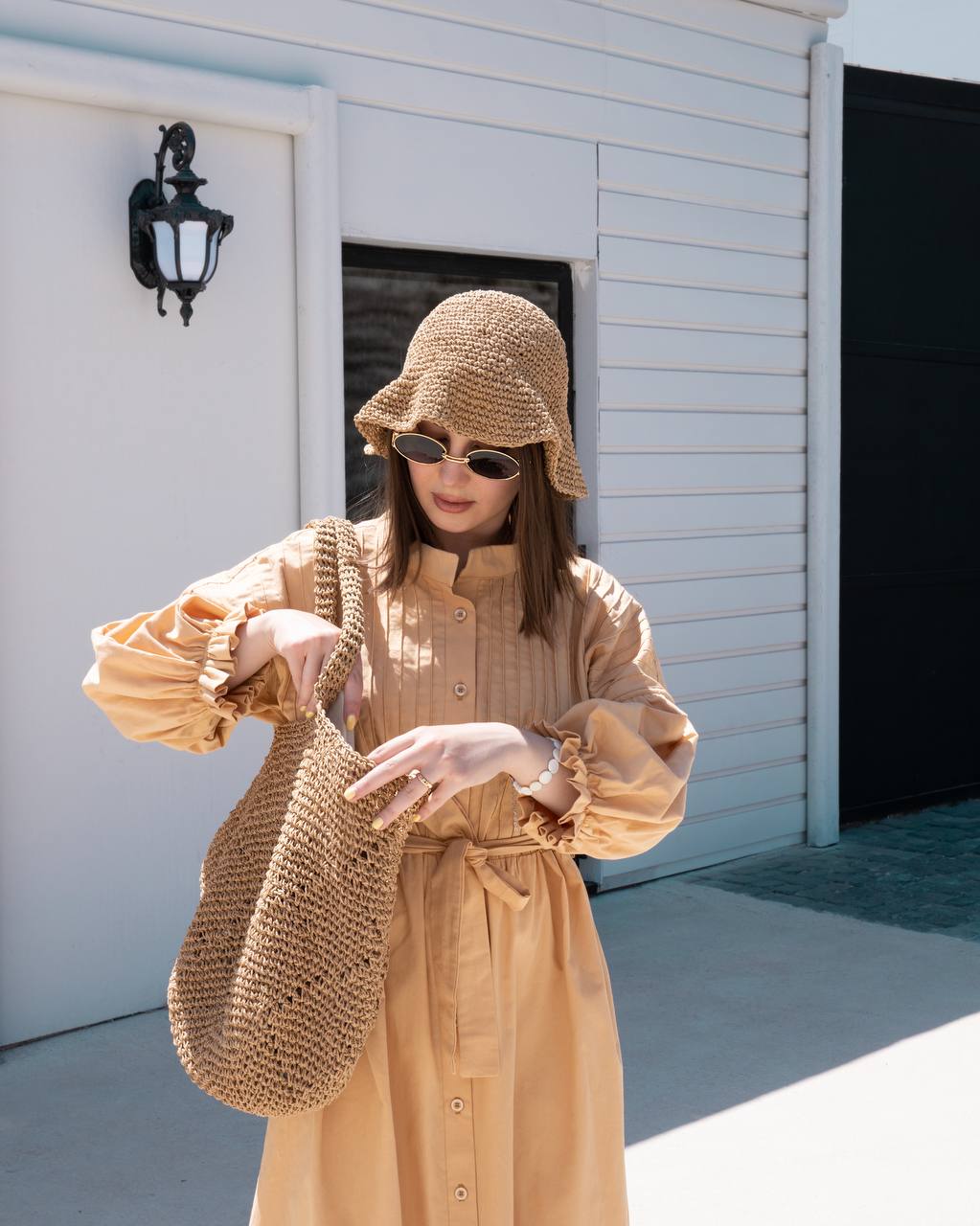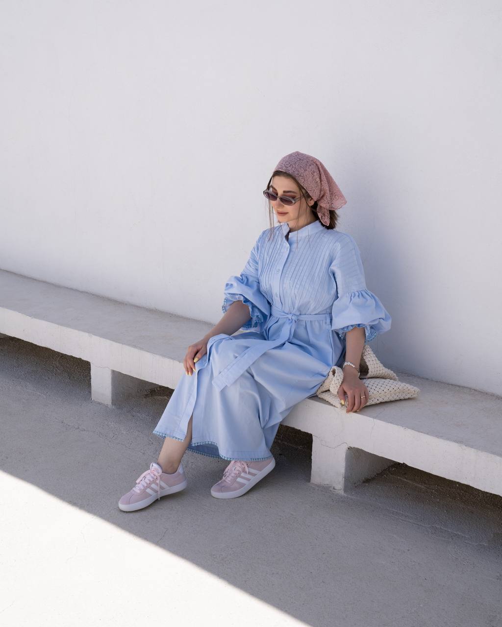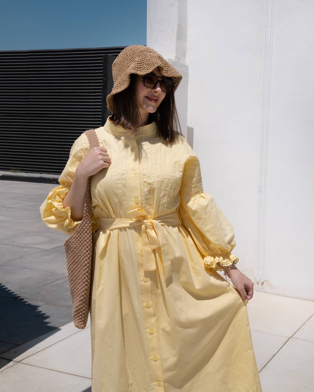 پیراهن زنانه نچرال لینن آستین پفی، فری‌سایز تا ۴۶