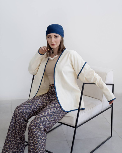 ست کت و شلوار زنانه آسمان لینن کرم و طرحدار فریسایز تا ۴۶